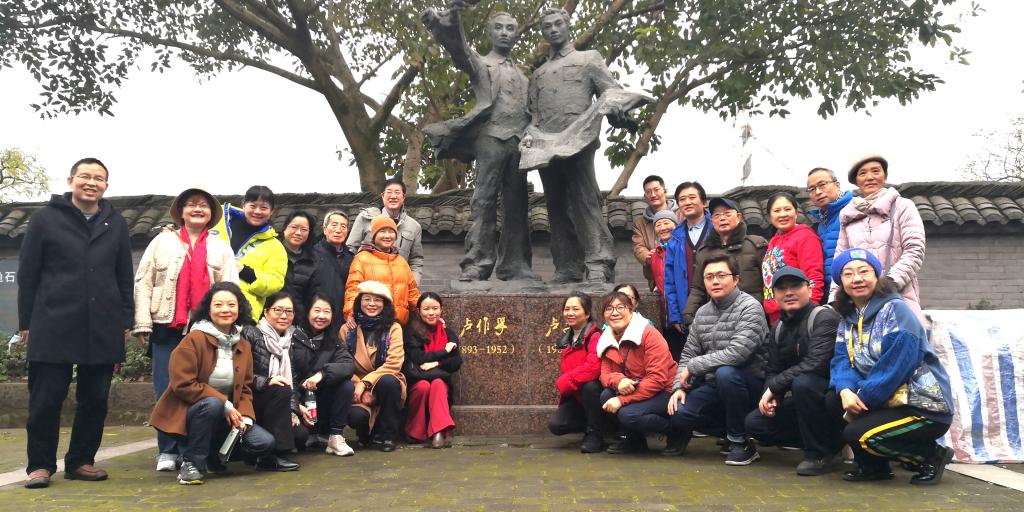 支部盟员在卢作孚、卢子英雕塑前合影