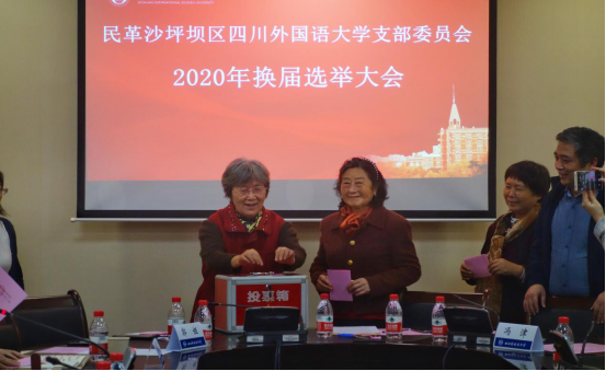 民革川外支部委员会换届选举大会由支部主委杨晓莲主持,沙坪坝区政协副主席、民革沙区主委钟树生、民革沙区专职副主委杨玉华、民革沙区副主委任洪涛、民革沙区办公室主任冯津参加了支部换届选举大会。
